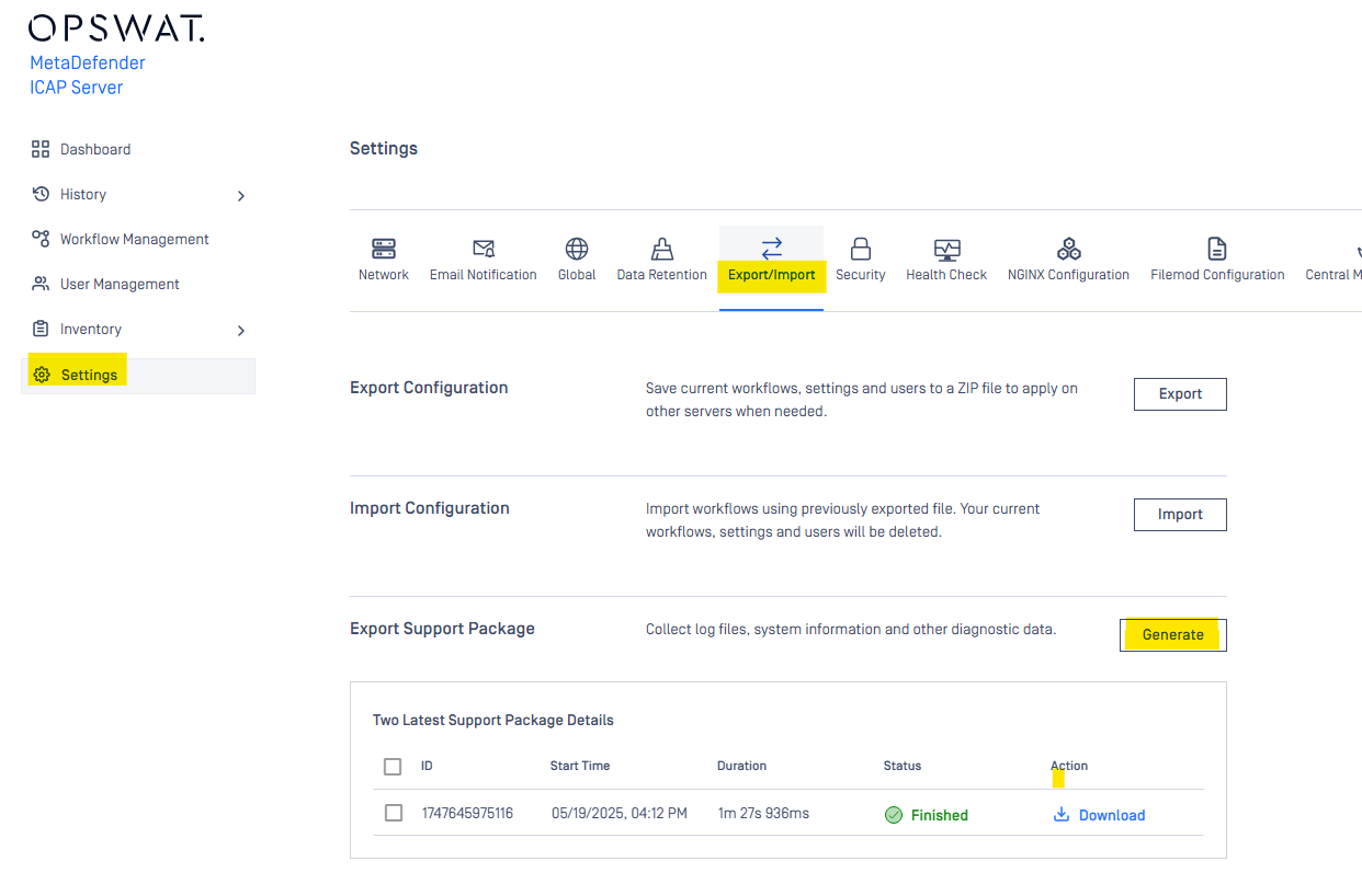 | New UI for Downloading Support Packages | Users can now generate and download support packages directly from the UI for troubleshooting purposes, instead of executing .bat or .sh scripts from the CLI. ![]() | |