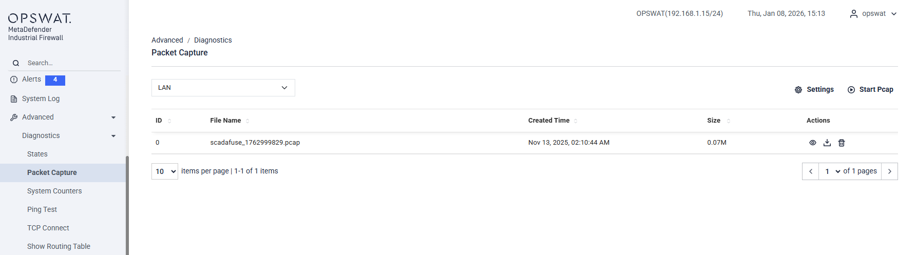 The Packet Capture page allows you to capture and download network traffic directly from a selected firewall interface for troubleshooting, diagnostics, and traffic analysis. This page shows a list of packet capture (.pcap) files created on the firewall and provides controls to start new captures.