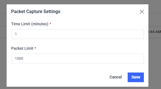 - Time Limit (minutes): Specify the maximum duration of the packet capture. The capture automatically stops when the time limit is reached.