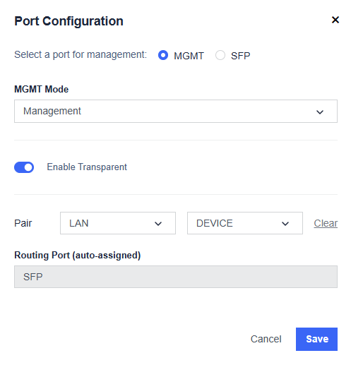 Management Port: The Management Port is used for administrative access. It can also forward network traffic when set to Routing mode.