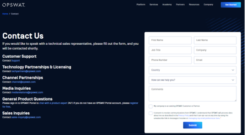 Navigate to the OPSWAT Contact page via This Link