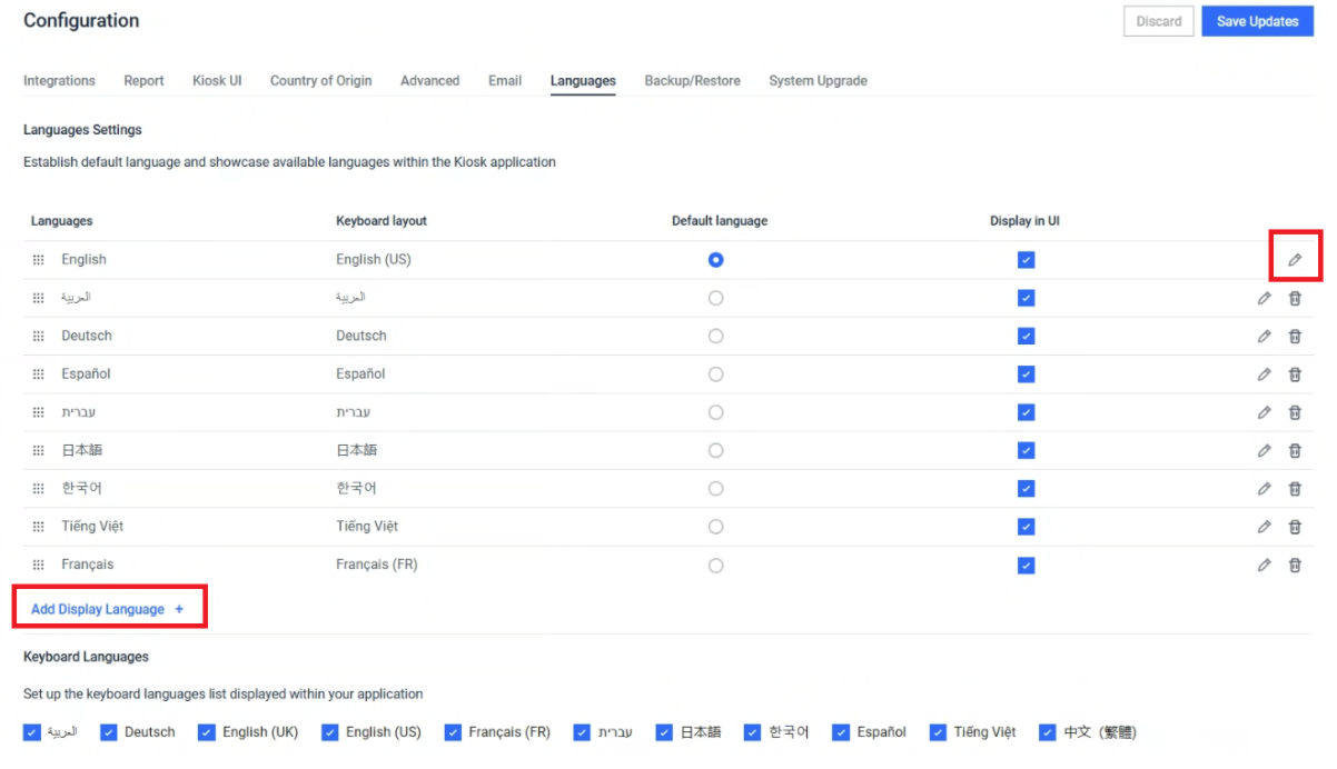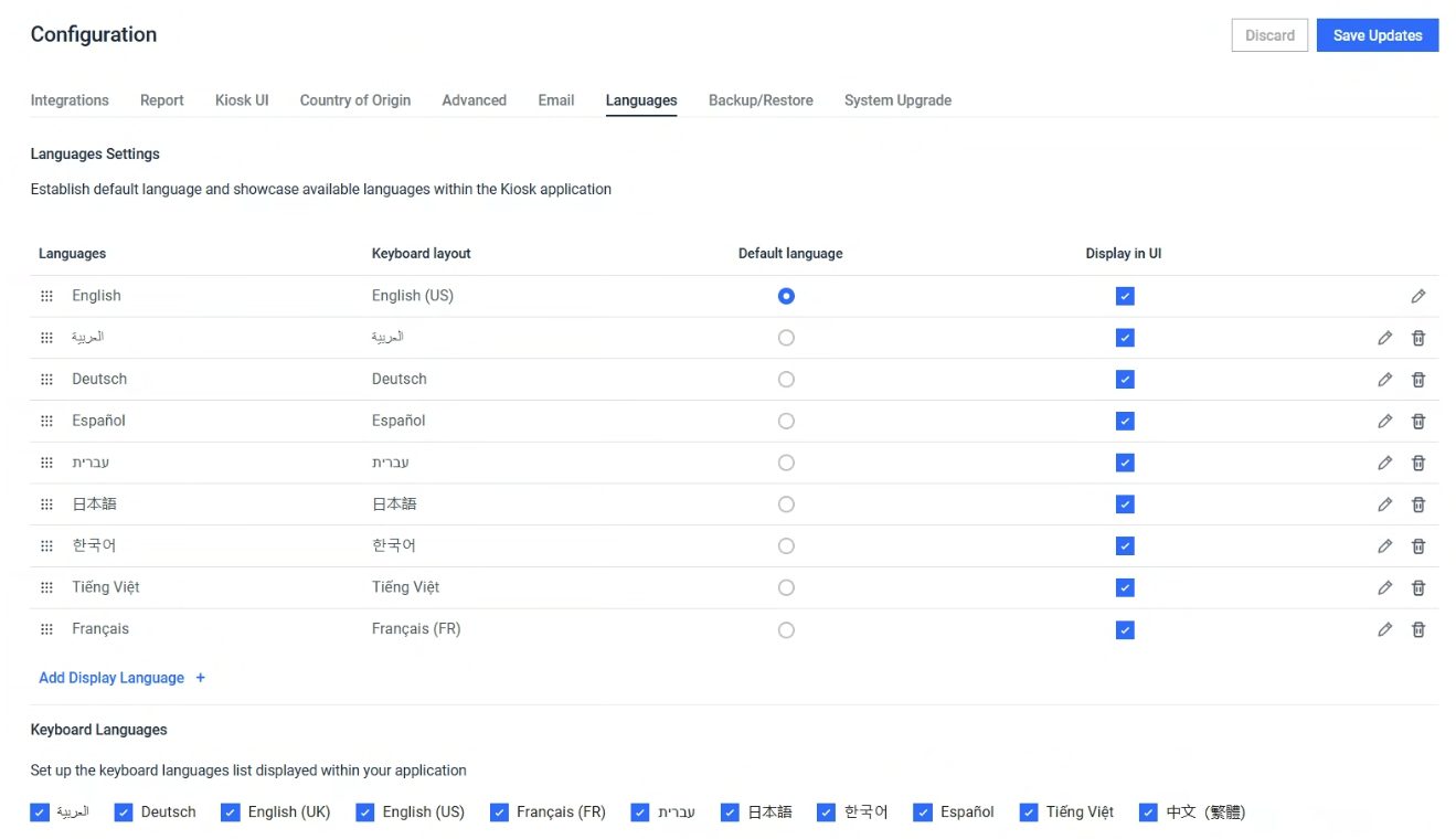 Kiosk supports multiple languages, allowing users to display the interface in their preferred language and administrators to configure language settings as needed