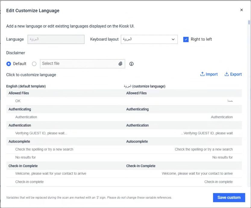 Starting from Kiosk version 4.7.9, administrators can export and import pre-defined (translated) language packs, making it easier to backup and reuse custom translation across devices. To export the languages pack, click on "Export" button, the exported file "<language>.json" can be used to import later.