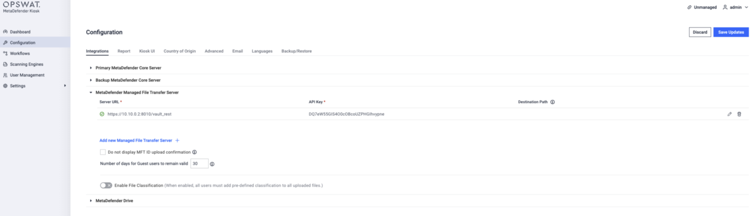 With the above in place, Kiosk will upload scanned files to MFT through the OPSWAT Data Diode (Blue → Red).