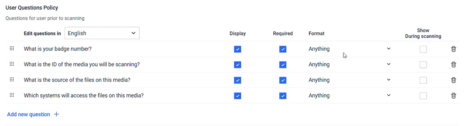 The User Questions Policy page lets you create questions for users to answer before processing files. You can require that these questions be answered before the user is allowed to continue. Any required responses are stored in the User Question section of the session log.