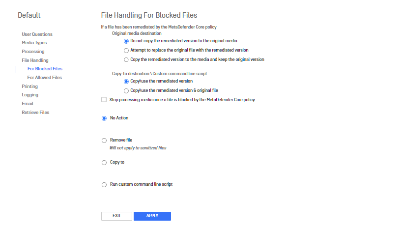 This option only exists for blocked files. If enabled, only remediated versions of blocked files will be copied to the destination. Any blocked file that was not remediated will not be copied.