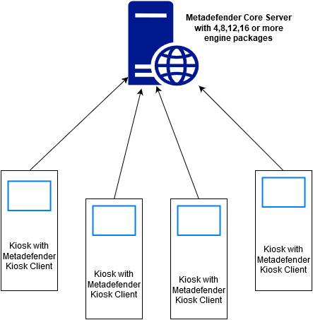Customers requiring high volume scans and faster performance should consider a distributed configuration where the MetaDefender Kiosk module is maintained on the Kiosk and the MetaDefender Core module is maintained on a powerful remote server.