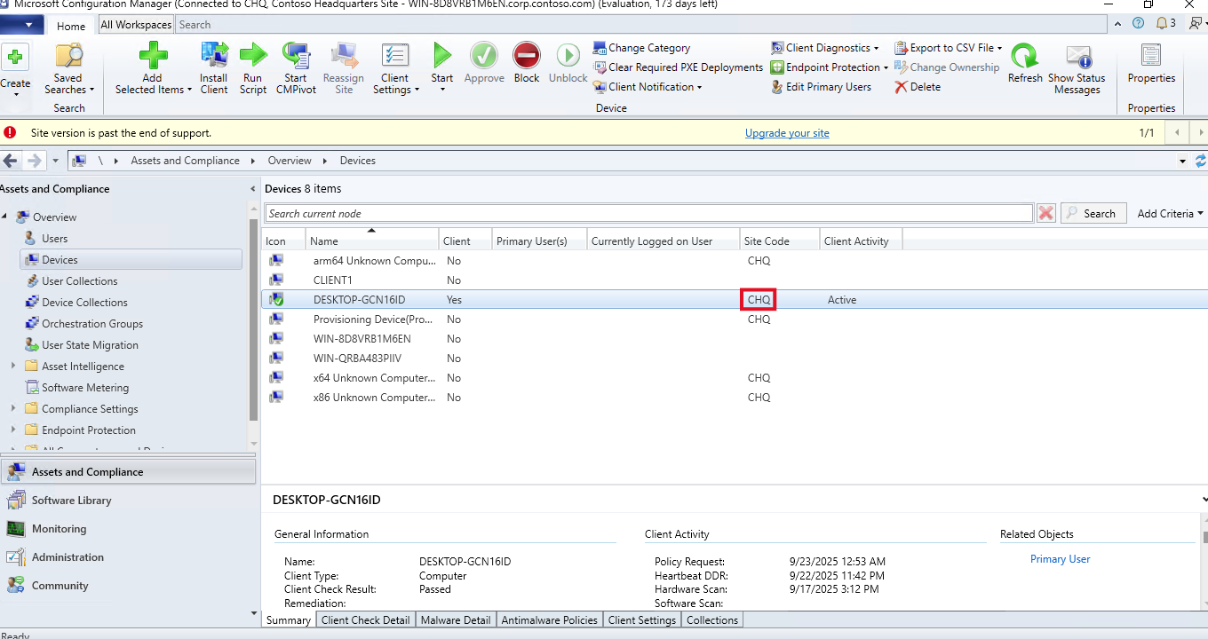 - From SCCM console, navigate to "Assets and Compliance" → "Devices". The "Client" column of the device should be marked as "Yes"