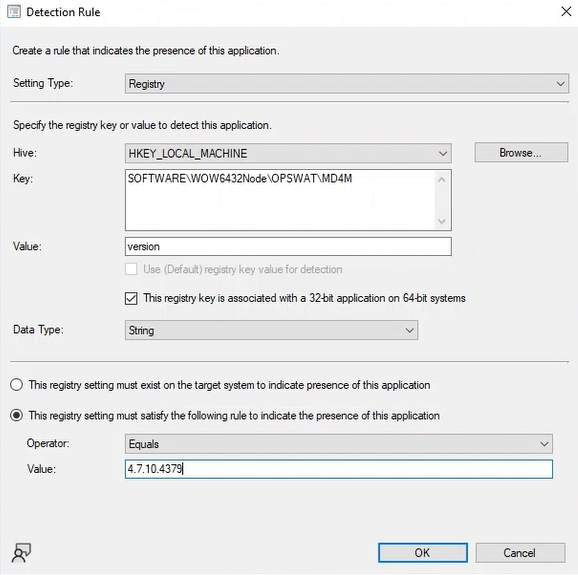 - For the Detection Method, this is the way that system detects if your application is successfully deployed on agent, on Kiosk, we will detect it by checking the specified registry, which is set after an installation or upgrade process. Add Clause and configure Registry in hive HKEY_LOCAL_ MACHINE, path SOFTWARE\WOW6432Node\OPSWAT\MD4M, value version, load it as String value and check if it is equal to to-upgraded version as detection type.
