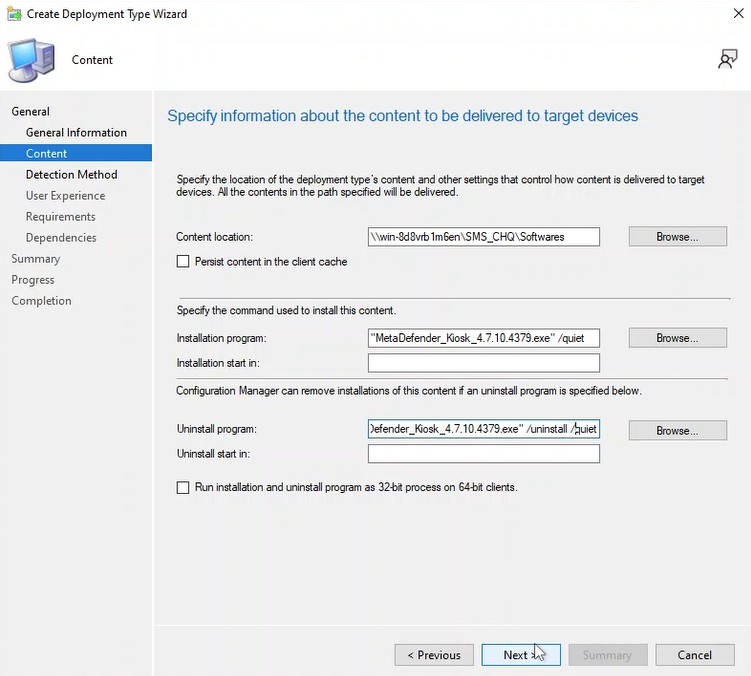 - The Kiosk application will be installed by command line, so we need to configure the command to run the installer. On the Content windows, configure the following