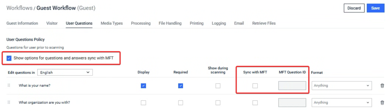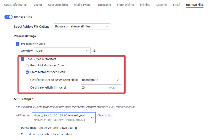 enabled, Kiosk sends user responses, allowing MFT to classify files based on