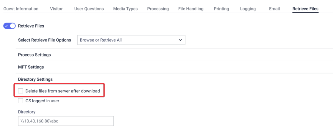 | Delete files after retrieval from local or shared network directories | Kiosk now supports an option to