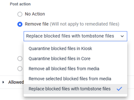 | Kiosk supports tombstone files on removal | Administrators can enable tombstone files to replace blocked files from both source and destination, providing traceability of removals.