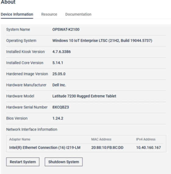 | Enhanced “About” page with system details | The Kiosk “About” page has been enhanced to display additional details, including the Core version, hardened image version, hardware specifications, service tag, and more. This expanded view provides valuable information for support and troubleshooting, improving the overall customer experience.
