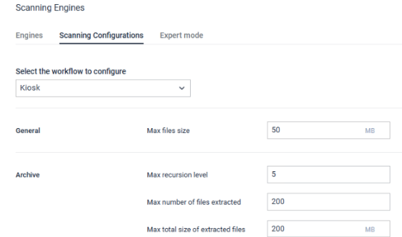 | New scanning engine status indicator | The Kiosk UI now displays a status indicator for scanning engines. If an engine encounters issues, a warning (exclamation mark) or critical (cross) icon will appear, signaling the severity. This enhancement improves user awareness and helps administrators quickly identify and address engine problems.