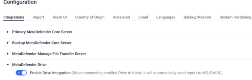 | Kiosk supports integration with MetaDefender Drive | Kiosk now supports direct integration with MetaDefender Drive. When an MD Drive is connected, Kiosk automatically uploads stored scan reports to the enrolled Central Management, removing the need for separate SDK installation and configuration.