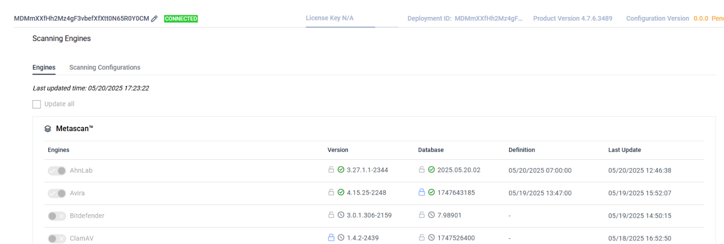 | Manage scanning engines from Central Management | Kiosk now supports managing scanning engines via My OPSWAT and OPSWAT Central Management, enabling easier configuration and consistent engine updates across multiple devices.