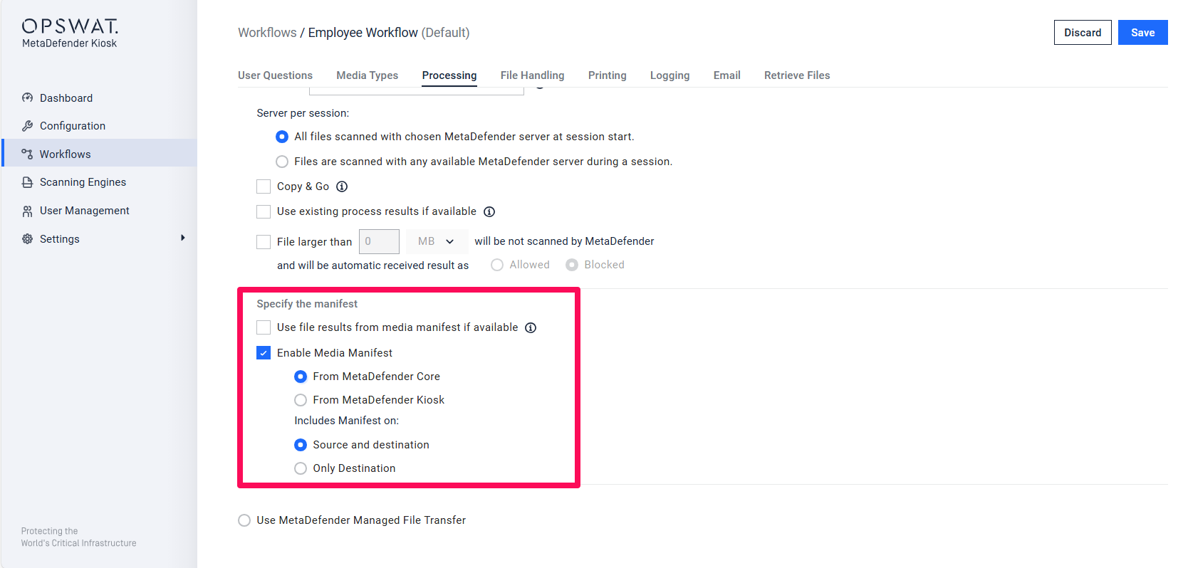 - Enabling the Media Manifest feature (via MetaDefender Kiosk)