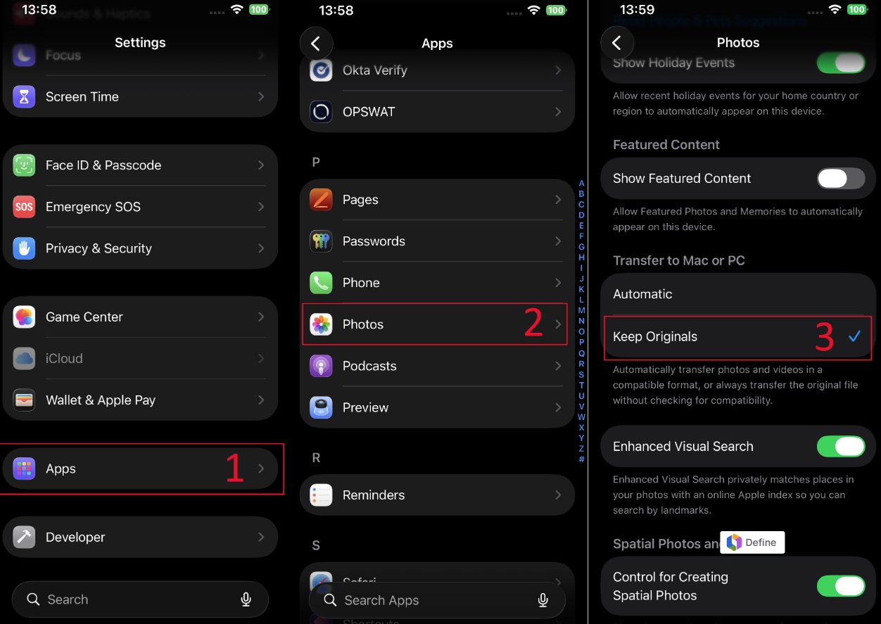 - Under "Transfer to Mac or PC", select "Keep Originals".