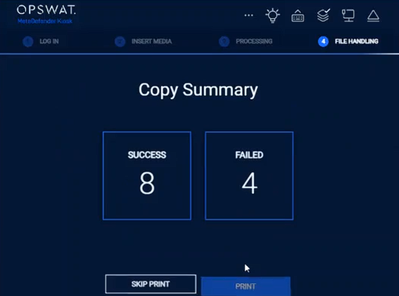 Once the file transfer completes, Kiosk shows the copy summary. User can click on 'Success' and 'Failed' to see details.