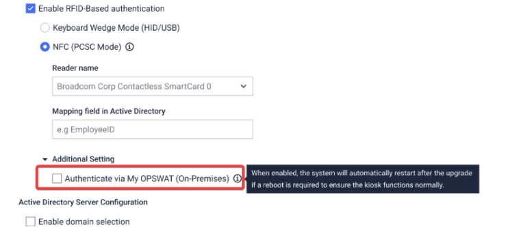 | Support for RFID and AD Login via OPSWAT CM10 | Kiosk now supports authentication through CM10, allowing users to sign in