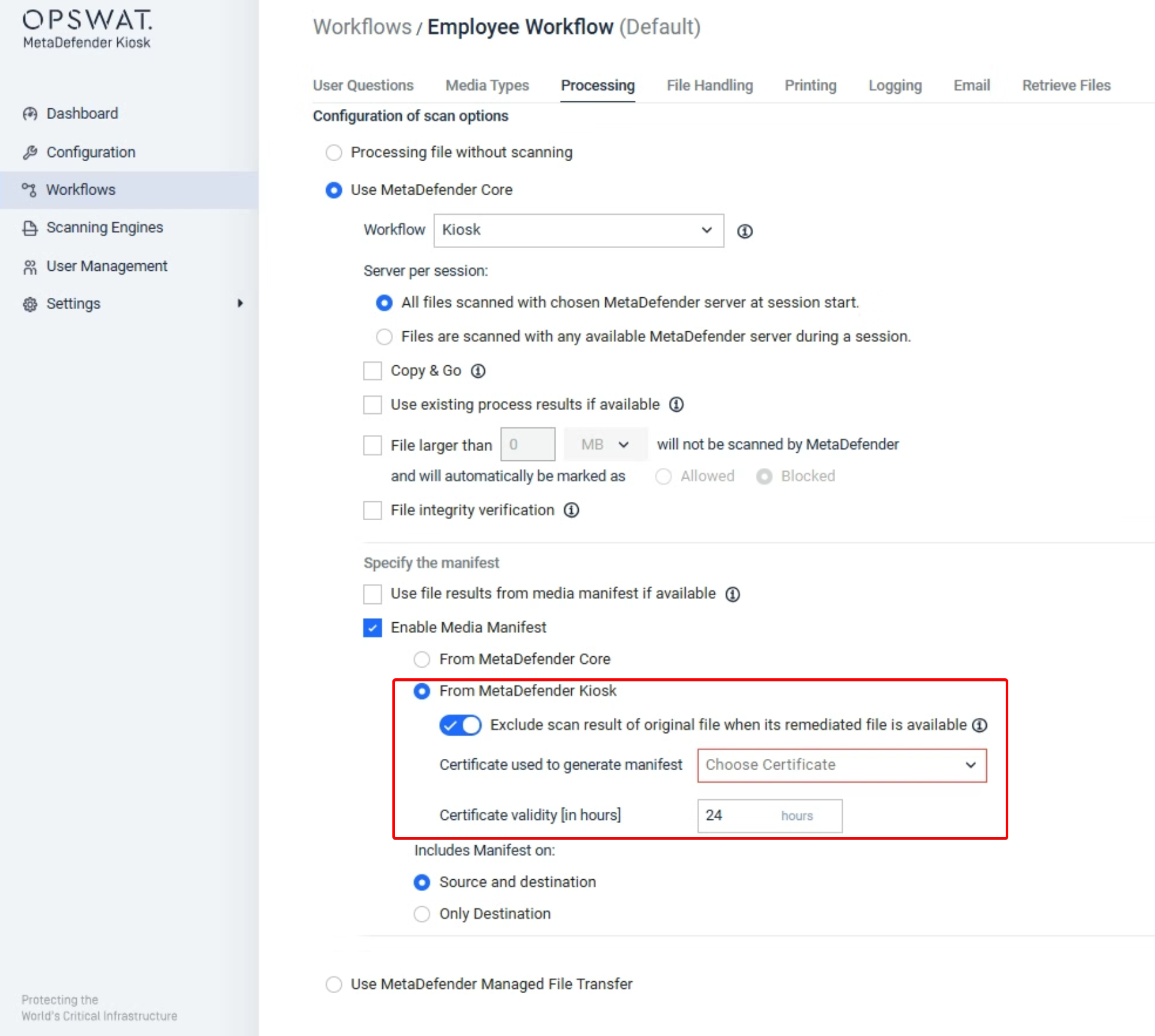 - Enabling the Media Manifest feature (via MetaDefender Kiosk)