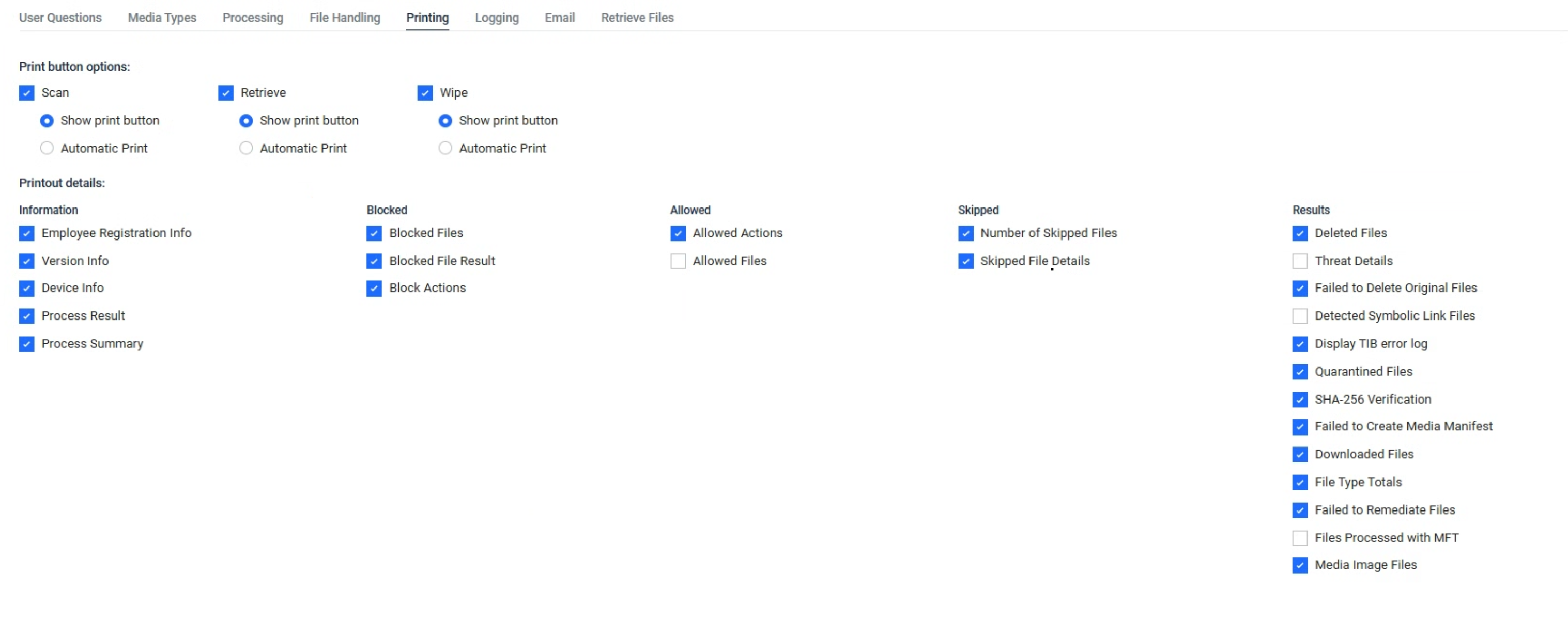 The Printing Policy page lets you determine whether users have the option to print a receipt of their session and if so, what information will be included on the receipt. The printing is enabled/disabled separately for each action Scan/Retrieve/Wipe.