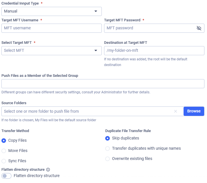 Use this type of job to automatically push files to a remote MetaDefender Managed File Transfer™ instance.
