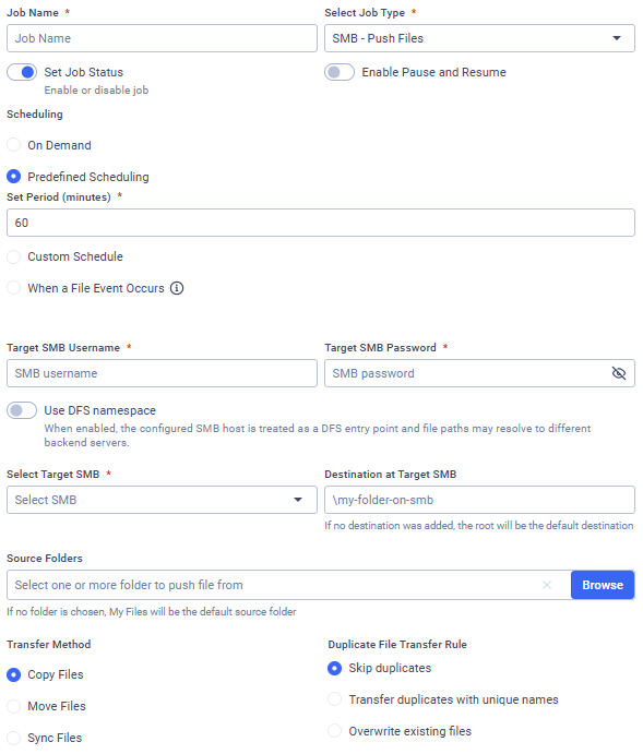 Use this type of job to automatically push files to a file share on a remote host using the SMB protocol.