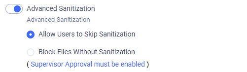 Block files without sanitization: Ensures that non-sanitized files do not become available for download and will reach a "Blocked: No Sanitization" state.