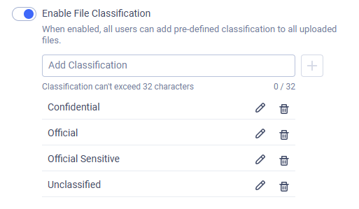 Enabling this option will allow the admin to define classification labels. The users can label their uploaded files by selecting one of these pre-defined classifications during the upload process or after that directly from the My Files menu.