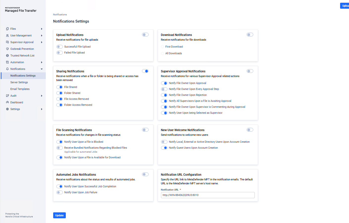 - Notifications are sent and configured individually for each MetaDefender Managed File Transfer. Duplicate notifications may occur if both MetaDefender Managed File Transfers are enabled to send them. Each MetaDefender MFT can be configured differently and notification settings such as "sender address" and "login URL" may vary.