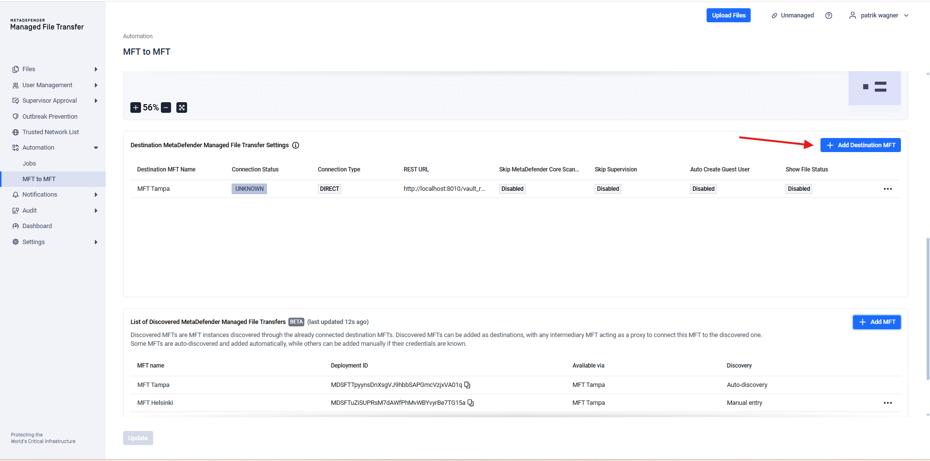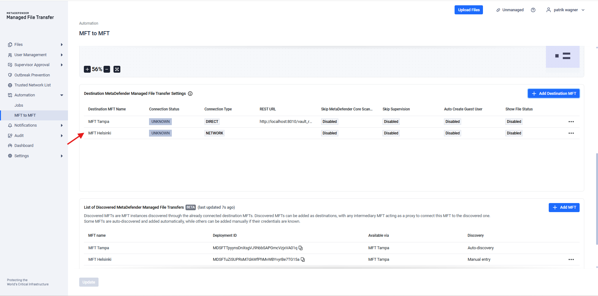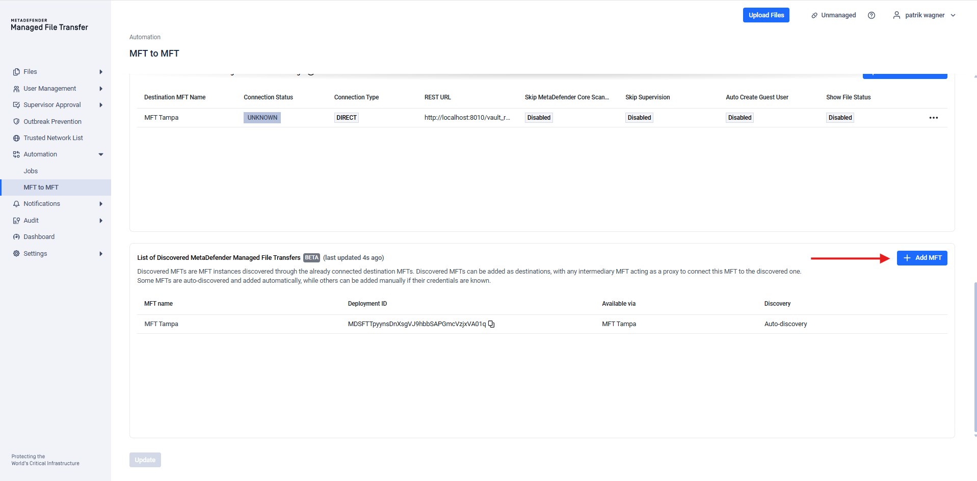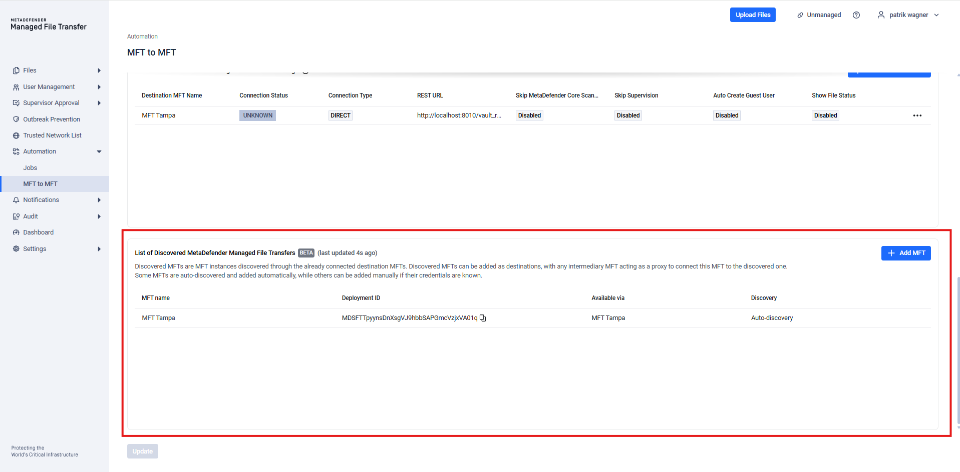 Remote MFT instances connected via the MFT to MFT feature to any node in the connected MFT network are automatically discovered and displayed in the user interface.