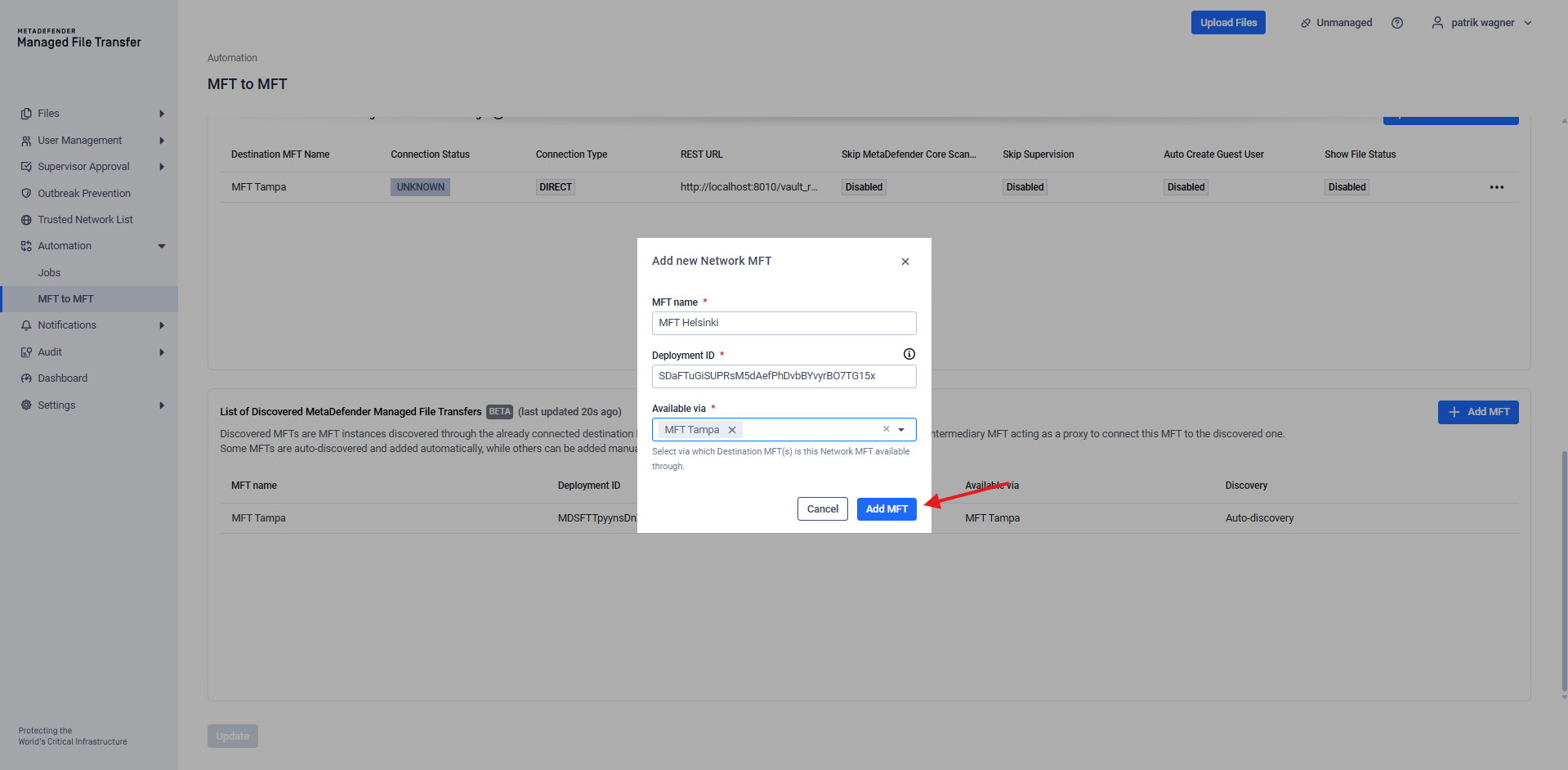 The MFT to MFT feature now allows administrators to select any previously discovered MFT as the destination when setting up a new connection. All intermediate MFTs automatically handle the synchronization process, securely proxying data from the source to the destination.