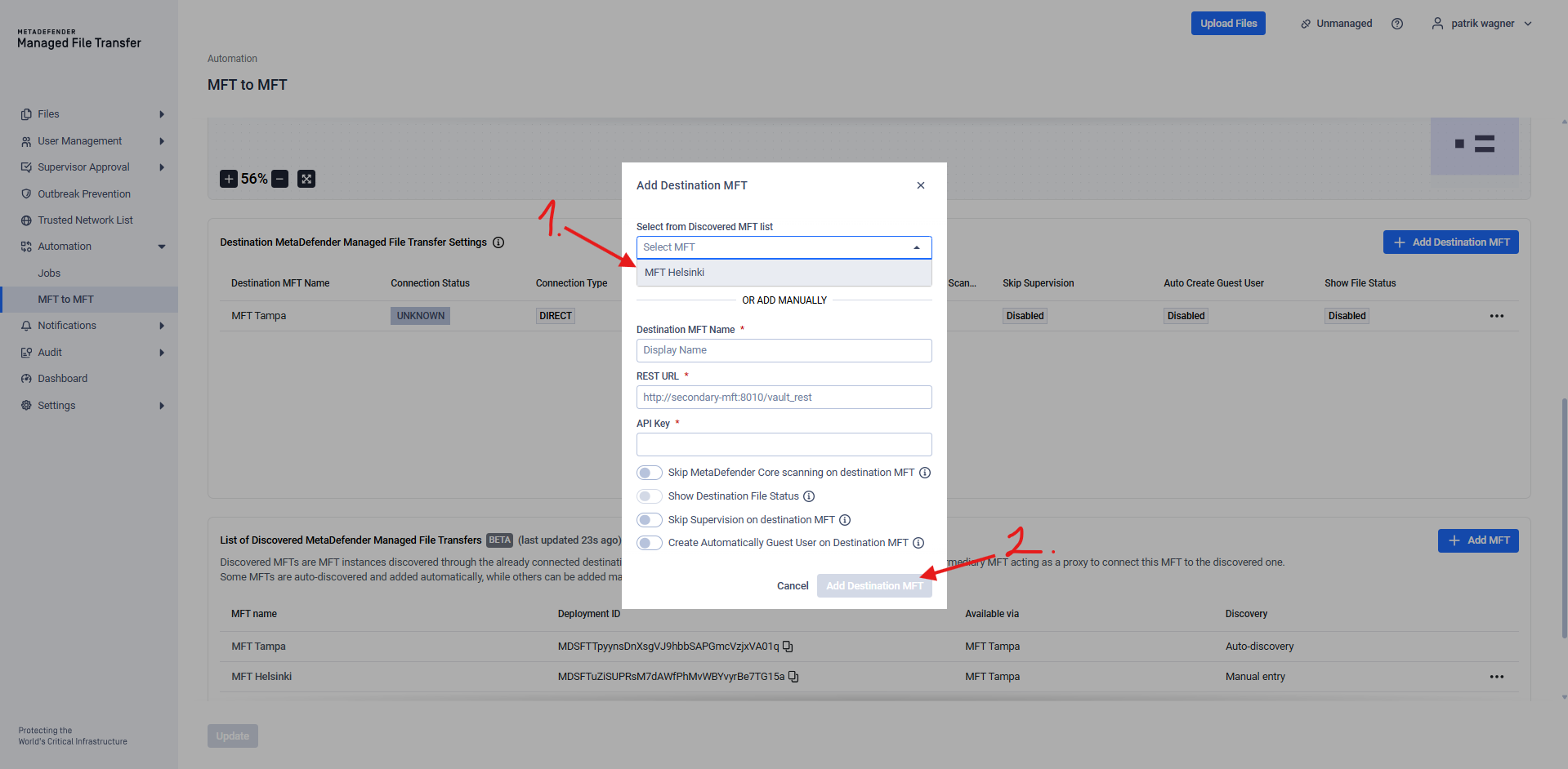 In restricted networks (e.g., with data diodes preventing discovery responses), administrators can still construct the topology manually. The discovery feature lets administrators register remote MFT instances by specifying: