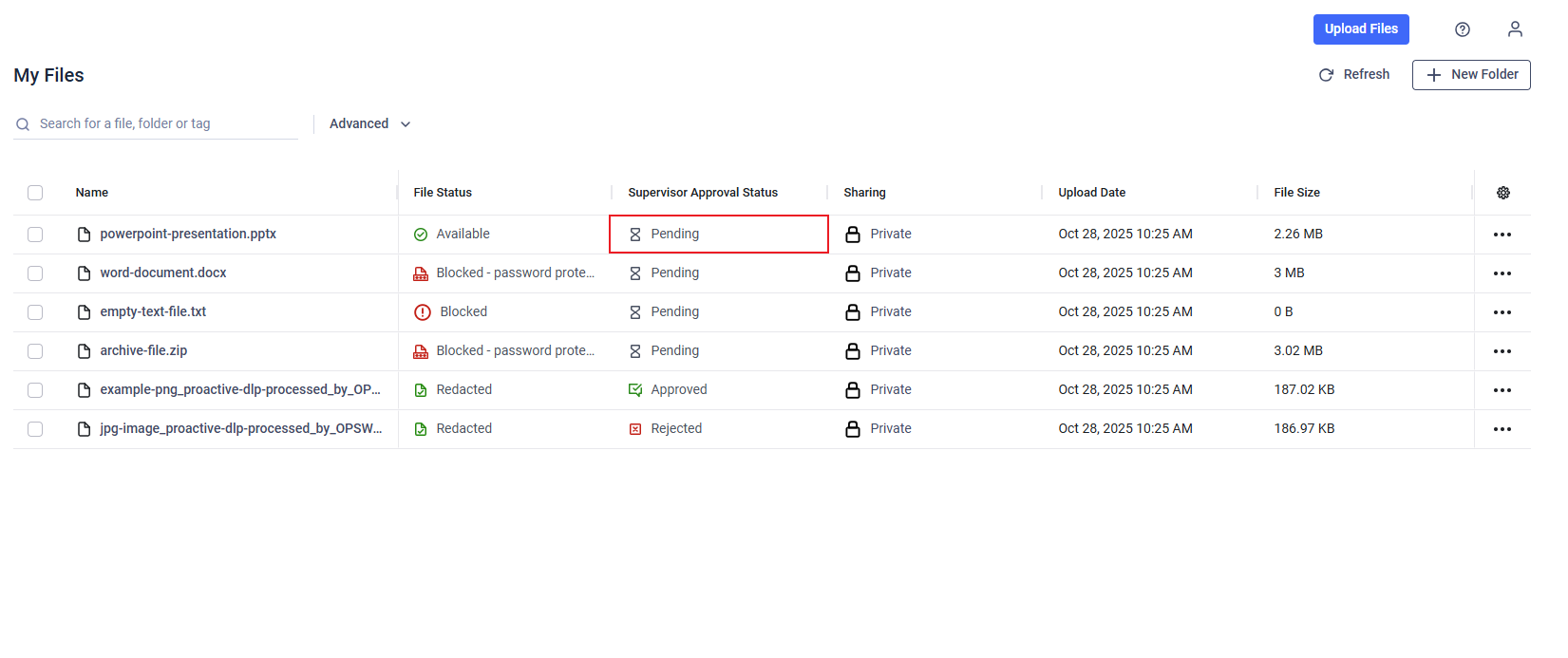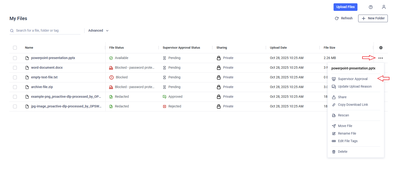 For more information about a specific file's approval status, click on the three-dot menu and select "Supervisor Approval."