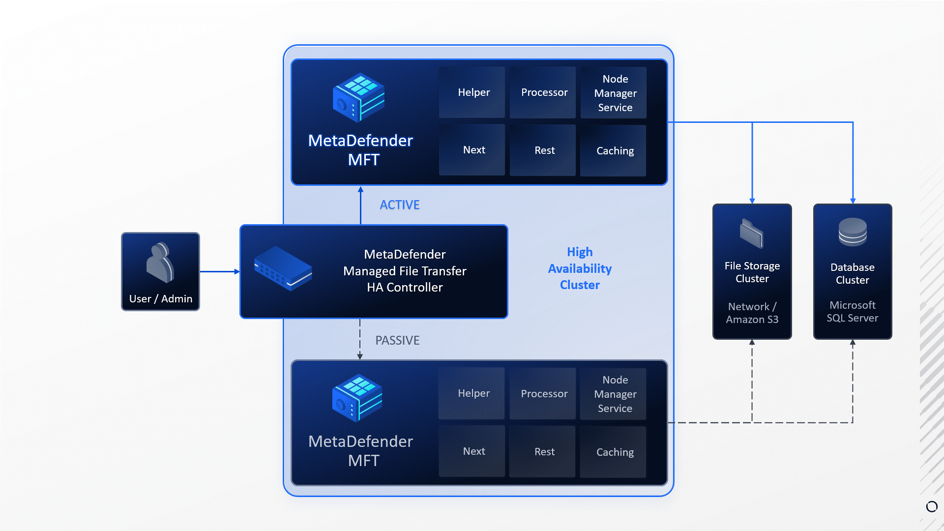 The MetaDefender MFT HA Controller™ periodically initiates health checks on each MetaDefender® MFT instance; if a service is found unhealthy, the controller will trigger a failover to the other node.