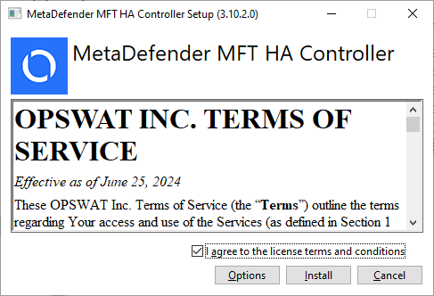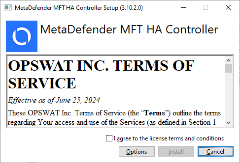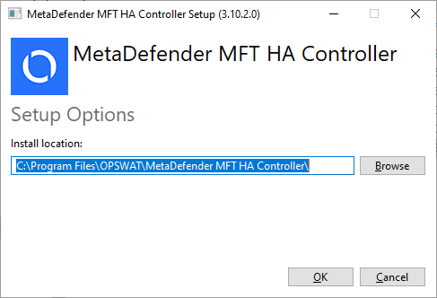 1. Choose installation directory if you want to install to a different location. The default installation directory is "C:\Program Files\OPSWAT\MetaDefender MFT HA Controller". By choosing the Options button, it can be changed.