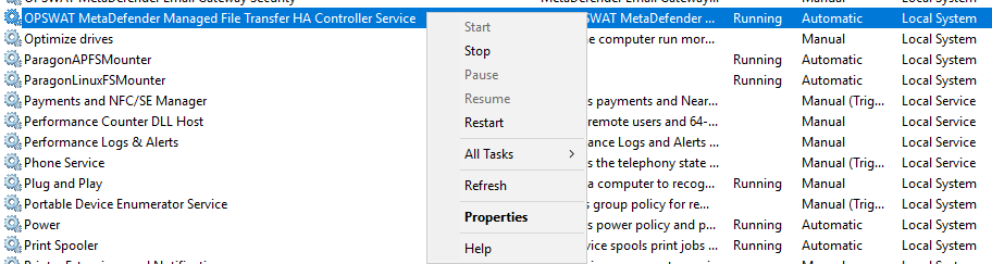 - On the MetaDefender MFT HA Controller™ machine stop the Windows Service. This prevents the controller from directing traffic or interfering during node upgrades.