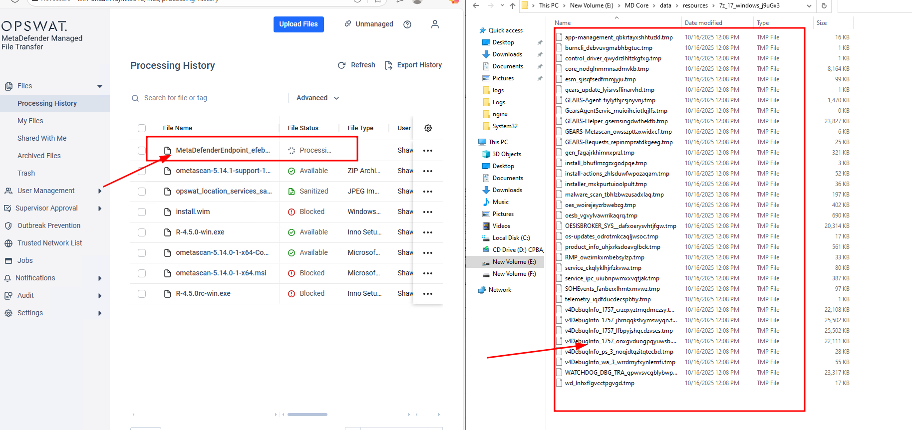 - How can the Temp folder be changed? This article provides steps to reconfigure the temporary directory used by MetaDefender Core to a different location with sufficient disk space: https://www.opswat.com/docs/mdcore/v5.9.0/knowledge-base/how-can-the-temp-folder-be-changed-