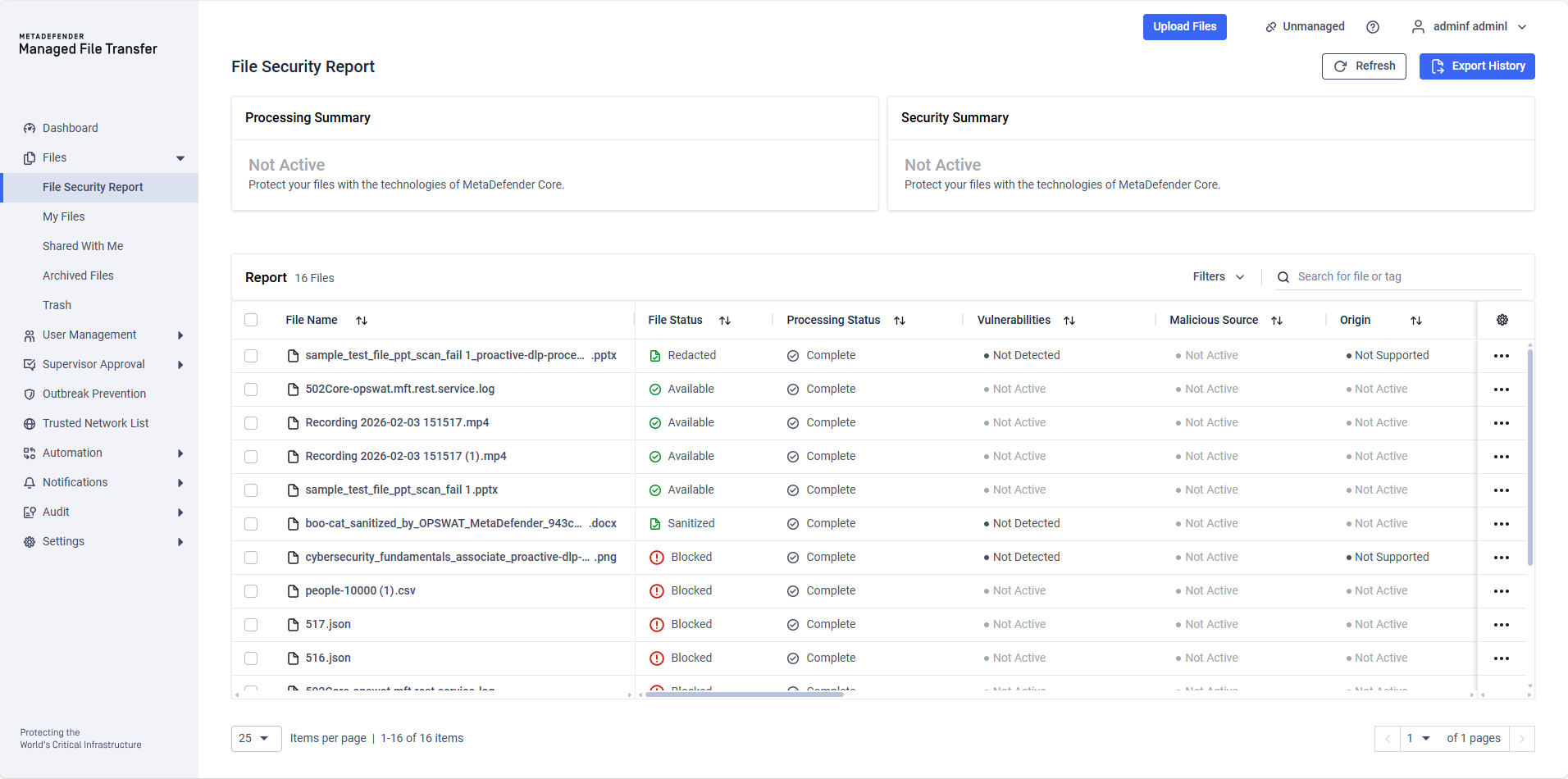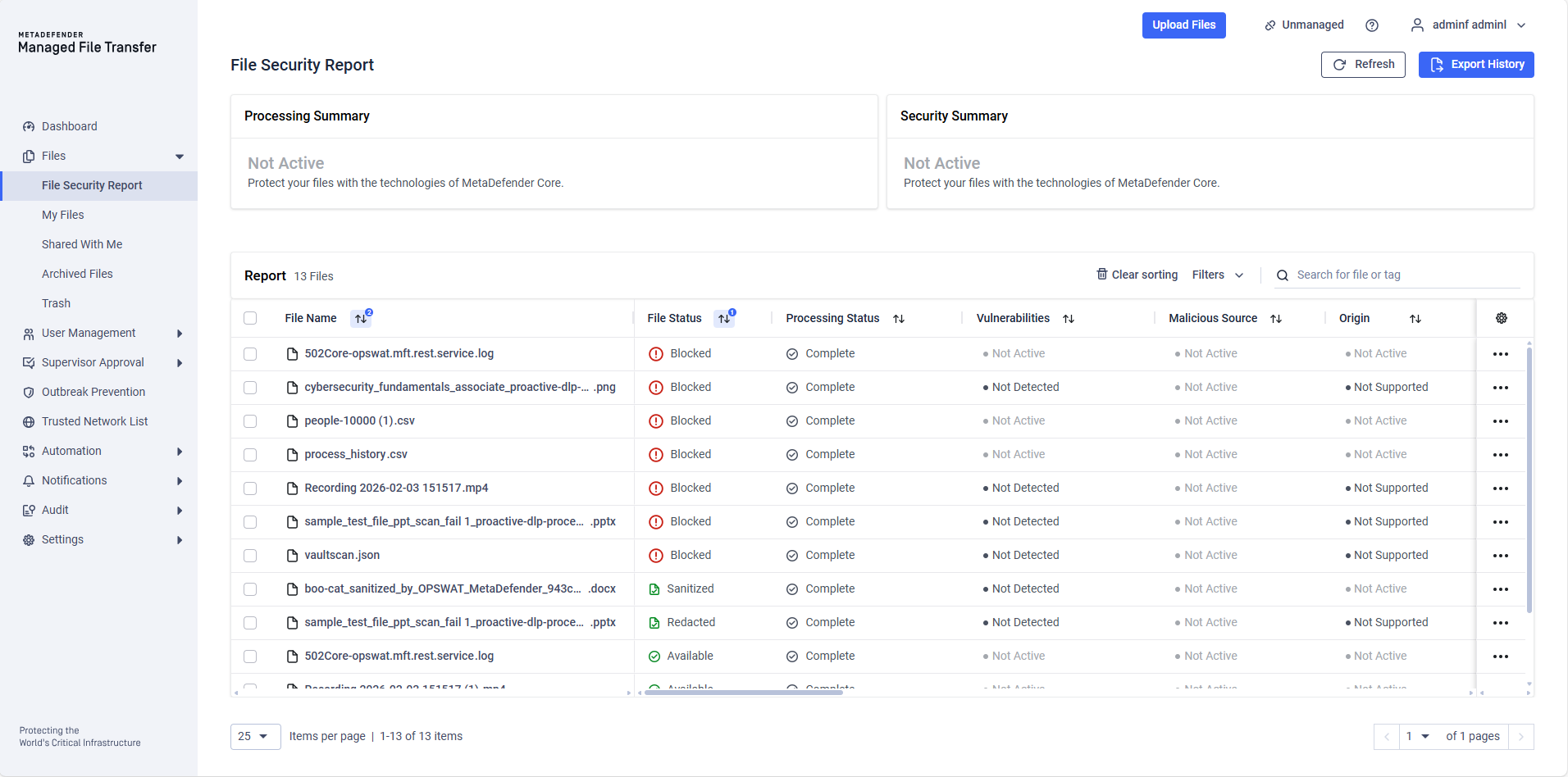 The "File Security Report" page allows users with specific roles to view files that have been uploaded to MetaDefender Managed File Transfer™.