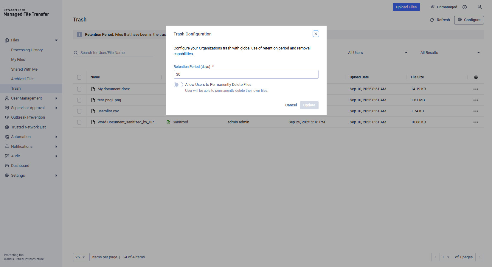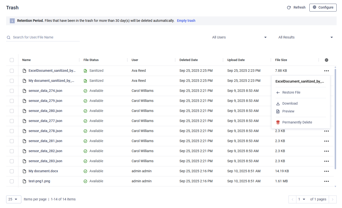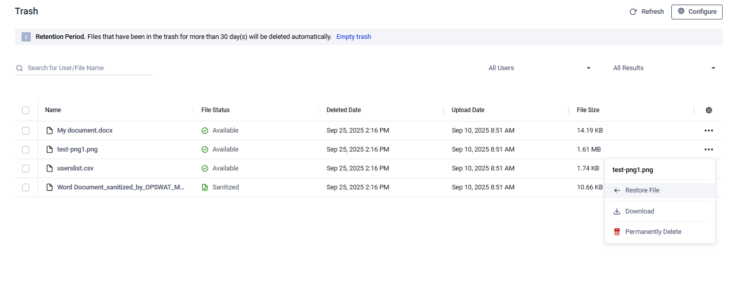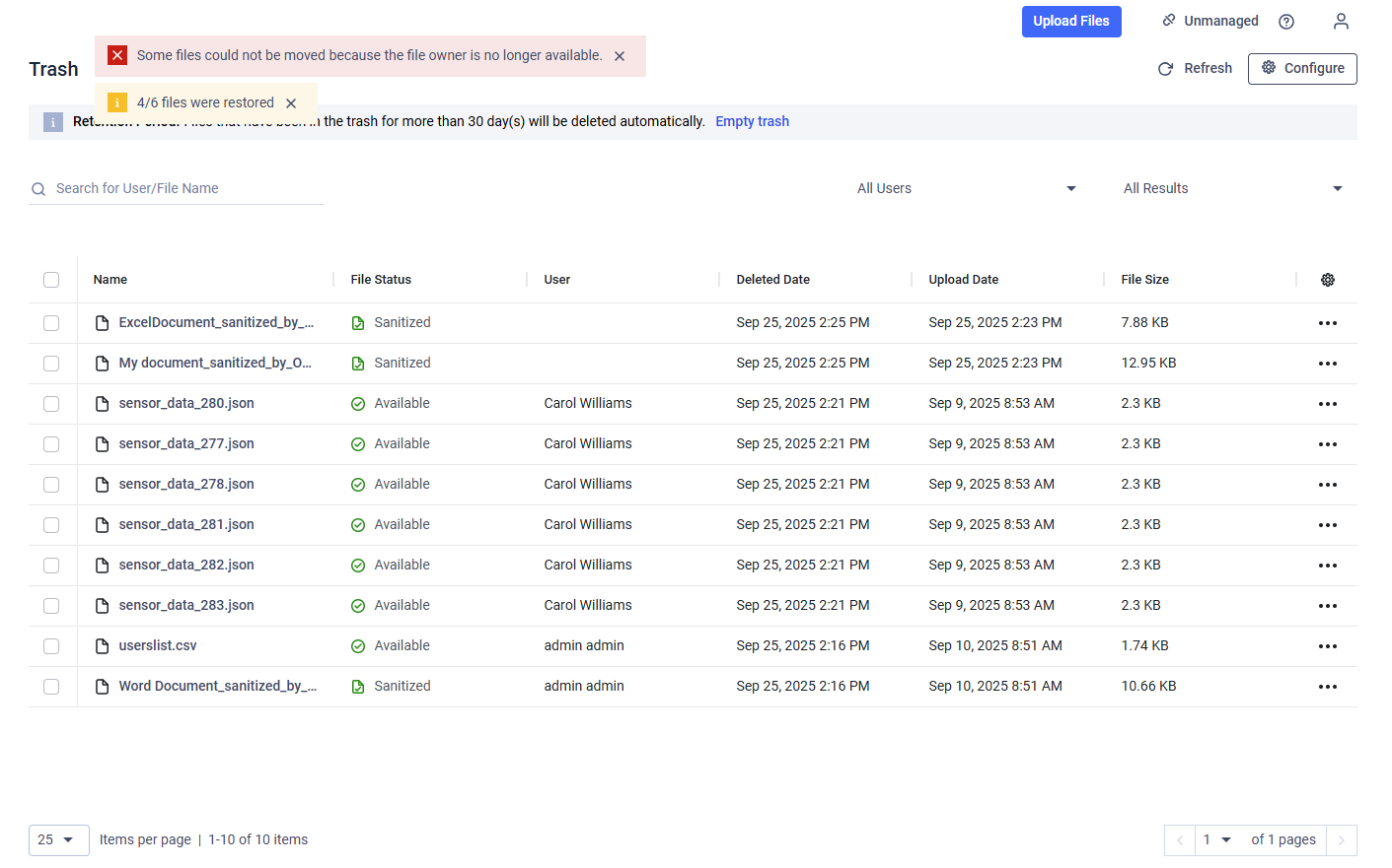 The Trash allows administrators to recover deleted files, permanently delete files, download files, and empty the bin.