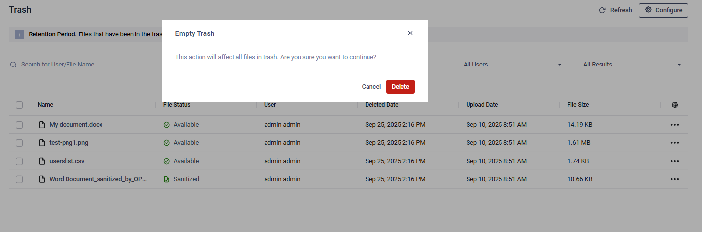 Administrators can permanently delete all files by clicking the "Empty Trash" button. A confirmation popup will appear.