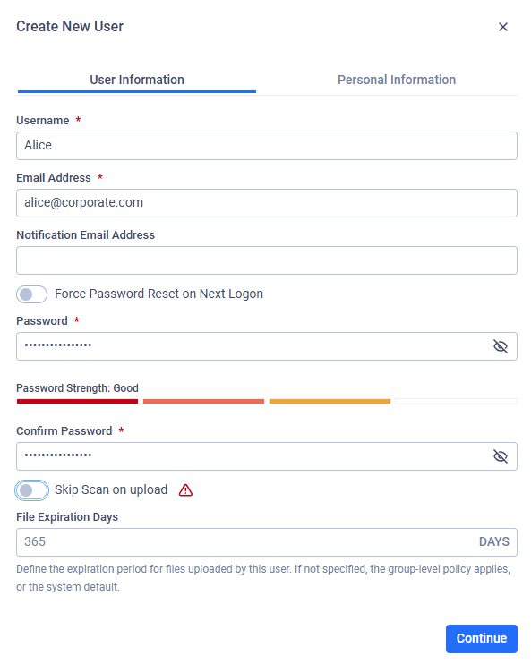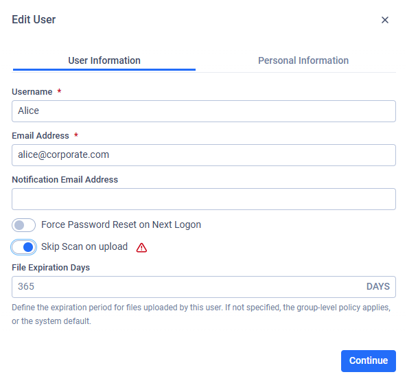 When creating or updating a local or external user, the "Skip Scan on upload" option can be configured under the user information tab. This setting affects future uploads only.