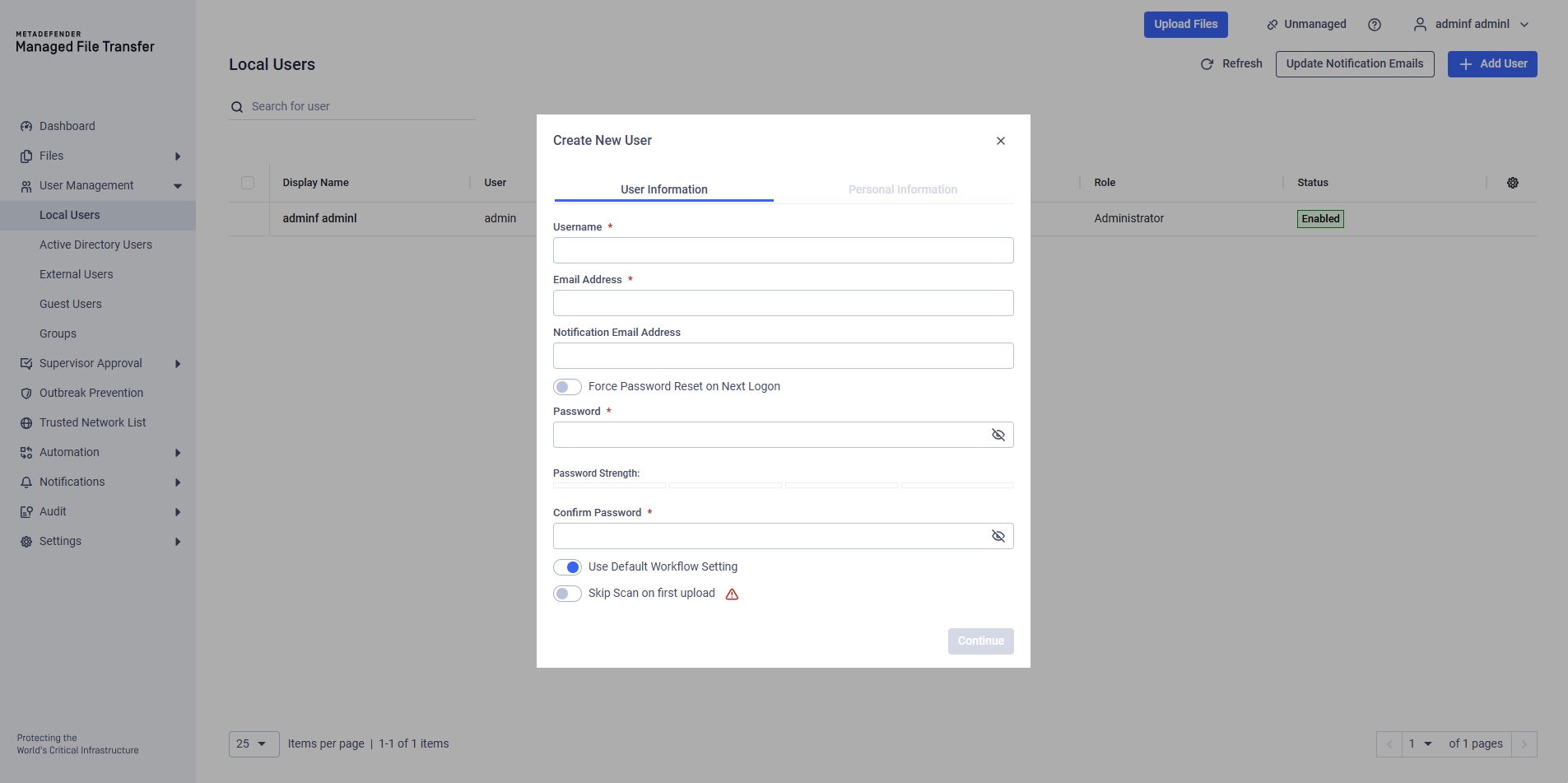 When attempting to delete a Supervisor, MetaDefender® MFT checks to ensure the user is not a mandatory Supervisor whose deletion would disrupt the Approval Process. In such cases, MetaDefender® MFT will not allow the deletion.