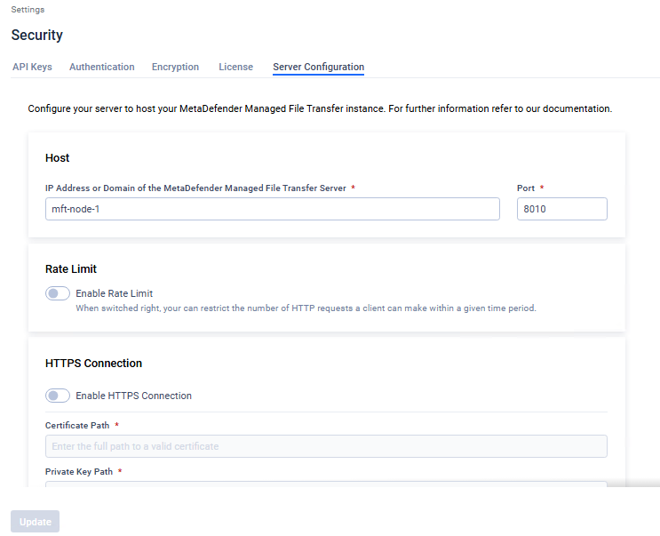 It's not necessary to align the MetaDefender® MFT Server Configuration across nodes. For instance, the hostname will inherently differ between nodes. Additionally, if Node1 has higher specifications and requires a larger rate limit, you can configure a higher rate limit on Node1 compared to Node2.