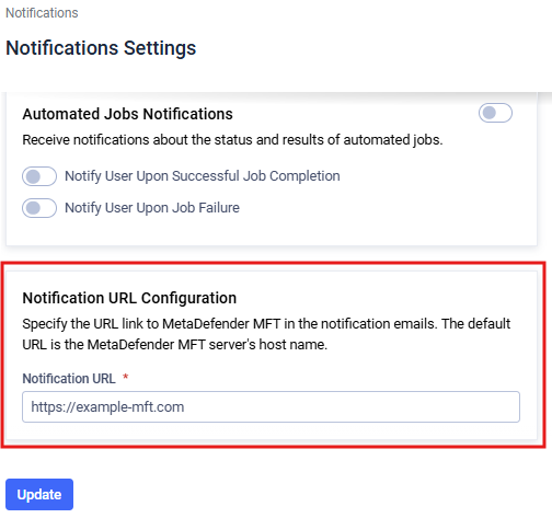 This address will be used in the email notifications as link to the MetaDefender® MFT. Since users will access the application through the MetaDefender MFT HA Controller™ the notification URL must be changed to it's address.