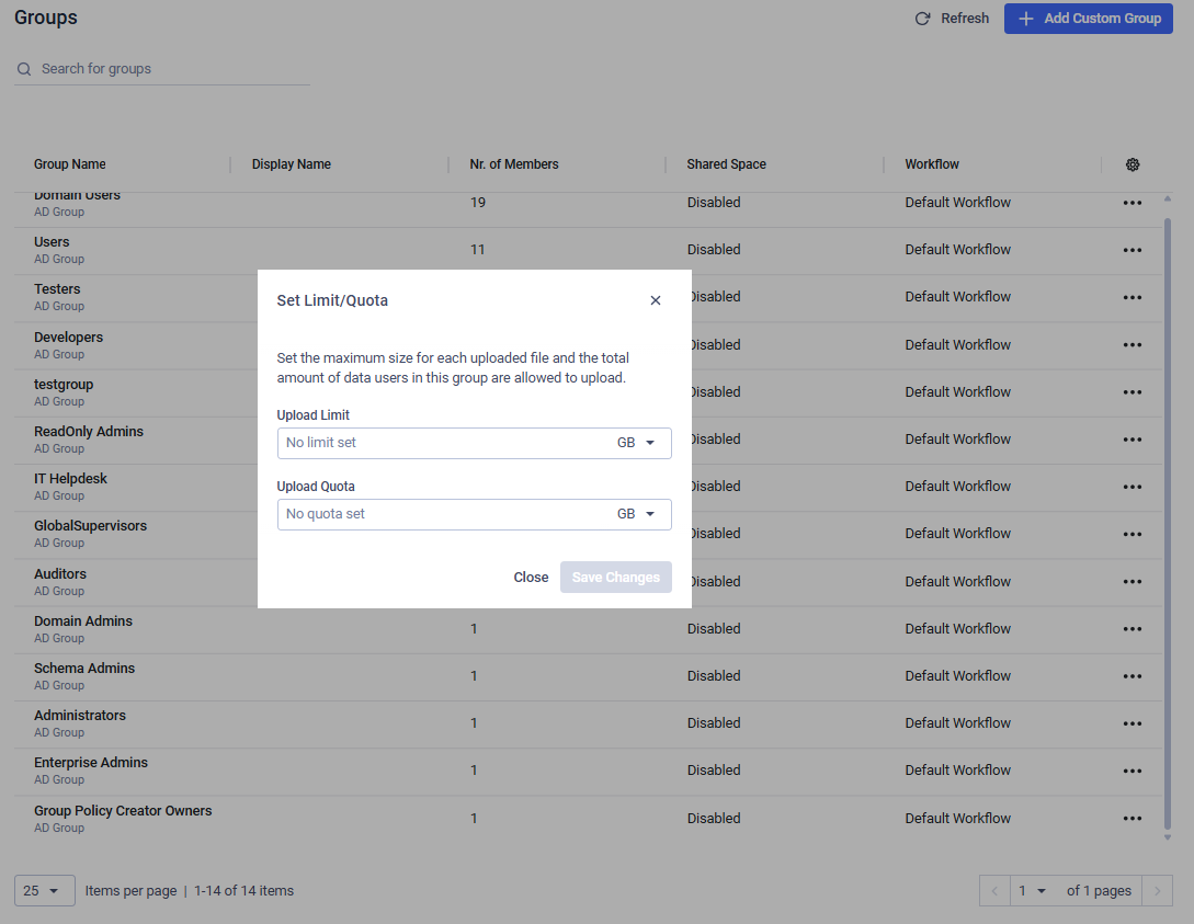 Administrators can define upload restrictions at the group level. For each Custom or Active Directory group, you may configure: