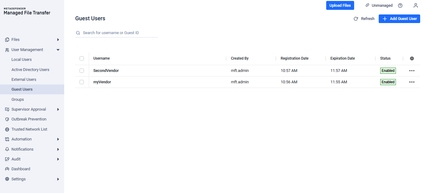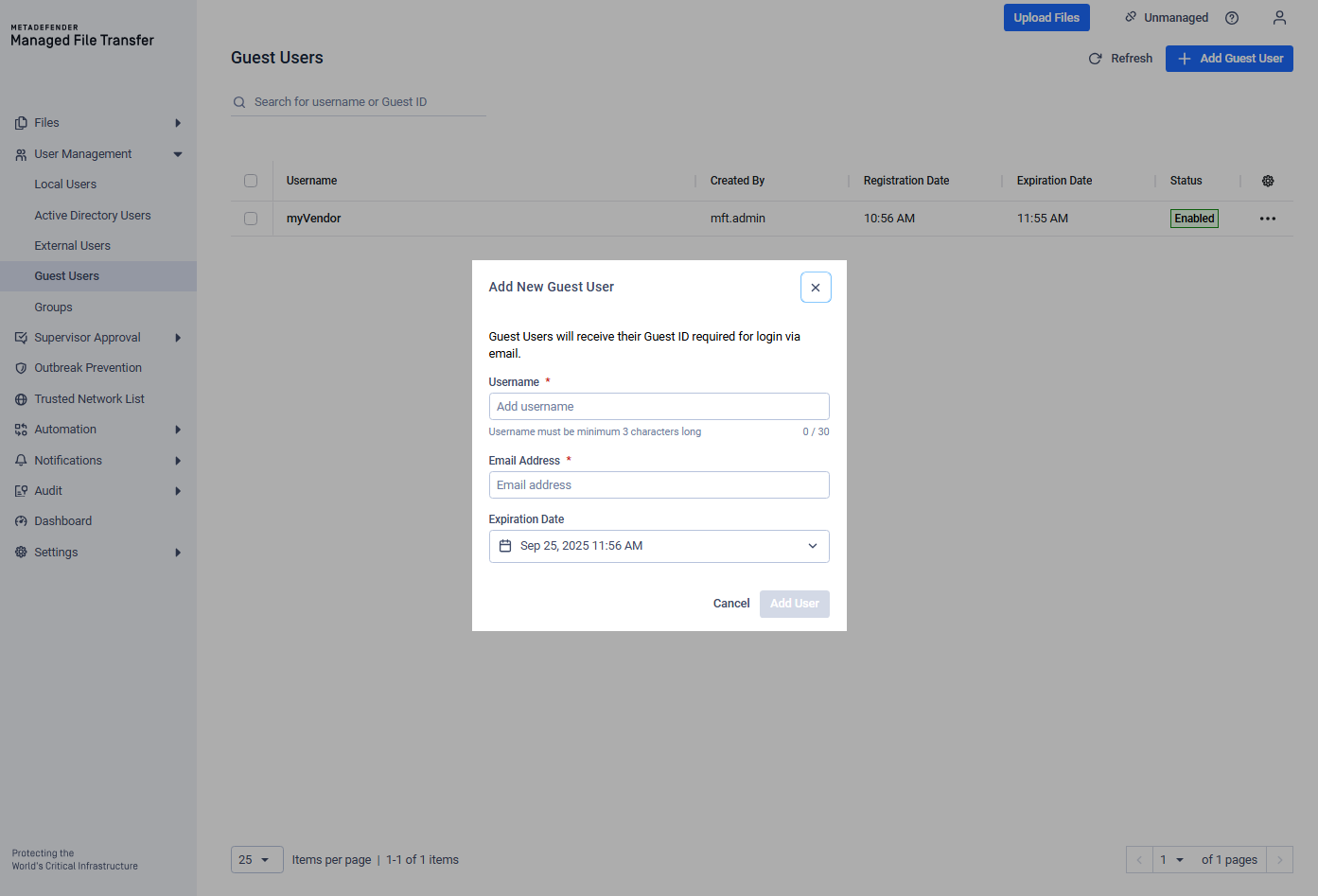 When attempting to delete a Supervisor, MetaDefender® MFT checks to ensure the user is not a mandatory Supervisor whose deletion would disrupt the Approval Process. In such cases, MetaDefender® MFT will not allow the deletion.