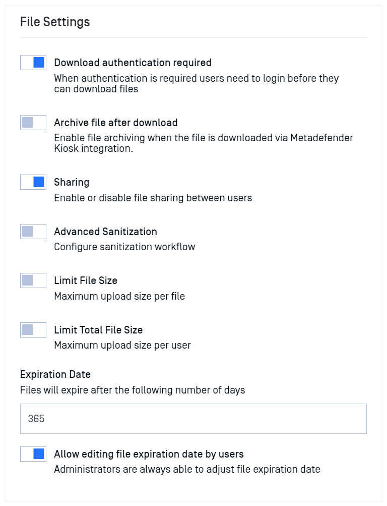 The following settings apply to all users and all files uploaded via MetaDefender Vault. Changing any of these settings will only affect files uploaded after the setting has been changed.